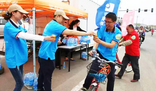 隨著騎行指令的發(fā)出,醫(yī)貿(mào)公司方陣有序進入賽道,每一輛自行車上插有帶企業(yè)logo的旗幟,如同一股藍色的溪流涌入騎行路線。為保障騎行秩序、確保人員安全,特成立后勤小組,現(xiàn)場為運動員分發(fā)水和食物。