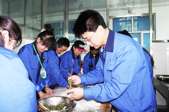 演出快要結(jié)束時(shí),數(shù)十名志愿者又轉(zhuǎn)移到了廚房,開(kāi)始包餃子,大家卷起袖子,搟皮的搟皮,包餡的包餡。公司領(lǐng)導(dǎo)莊總也與志愿者們一起投入到了包餃子的行列中。